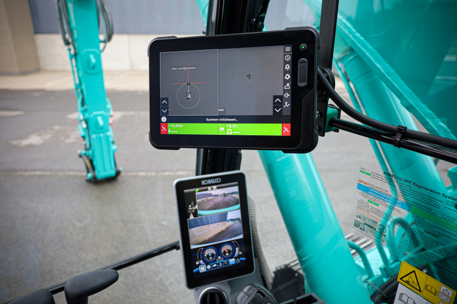 La pelle sur chenilles a été équipée par les experts de De Bruycker-Kemp avec plusieurs options, notamment un système de graissage automatique, le système de mesure 3D Topcon X53X IMU, une boîte à outils montée sur le châssis, un attache rapide hydraulique, le nom du client ainsi qu’un contrepoids peint.