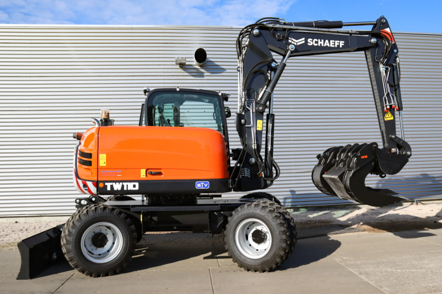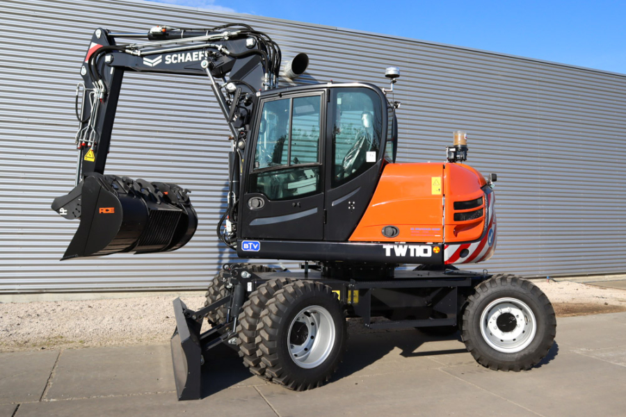 De compacte en stabiele Schaeff TW110, uitgerust met een 3-delige hydraulische verstelbare giek, weegt circa 11.000 kg en heeft een vermogen van ca. 116 pk. De TW110 is comfortabel, sterk en efficiënt. Deze Schaeff TW110 mobiele graafmachine heeft weinig ruimte nodig, verbruikt weinig brandstof en biedt daarbij veel comfort voor de machinist.